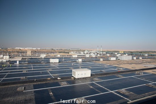 (通用在西班牙薩拉戈薩市的廠區屋頂安裝太陽能電池,左側(ce) 黃點為(wei) 施工工人)