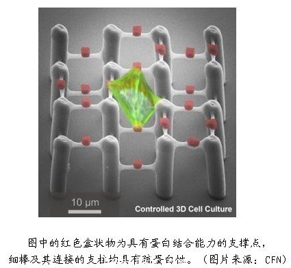 在這項研究中,研究人員采用了一種具有疏蛋白(protein-repellent)性的柔性聚合物,並以一種可結合蛋白材料作為(wei) 聚合物的盒狀支撐點,通過激光直刻法(Direct Laser Writing Method)製作出一種特殊的聚合物支架。這種支架的疏蛋白結構由25微米高的支柱組成,各個(ge) 支柱之間通過細棒連接,連接點高度不一,然後盒狀支撐點被精確地放在細棒中間。當含有粘附蛋白的溶液浸入支架時,蛋白隻會(hui) 與(yu) 盒狀支撐點相結合,兩(liang) 小時內(nei) ,個(ge) 體(ti) 細胞占滿支架,且隻粘附在特定位點。由此,通過改變支撐點和細棒的位置,可實現對細胞形狀的三維控製。