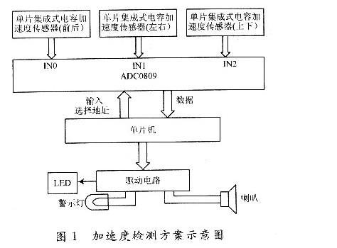 設計方案如圖1所示:包括傳(chuan) 感器及外圍電路、信號處理裝置、顯示報警電路等3部分。傳(chuan) 感器及外圍電路封裝於(yu) 小型屏蔽容器內(nei) ,固定於(yu) 導彈載行車上,ADXL50加速度傳(chuan) 感器采集振動加速度信號,並輸出相應的電壓信號;信號處理部分接收到傳(chuan) 感器采集來的模擬電壓信號,對其進行模/數轉換,將加速度的值顯示於(yu) LED上,然後進行數據判斷與(yu) 處理,當超過安全範圍時給出報警,提醒司機注意駕駛。