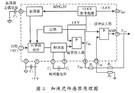 方案擬采用美國AD公司生產(chan) 的ADXL50加速度計作為(wei) 加速度傳(chuan) 感器。該器件集成在單片集成電路上,采用差動電容作為(wei) 敏感元件,直接輸出電壓信號,便於(yu) 信號的采集與(yu) 處理。