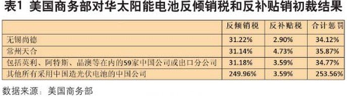 5月18日美國商務部宣布對中國輸美太陽能電池(包括采用中國太陽能電池的其它國家太陽能模組)征收31.14%至249.96%的高額反傾(qing) 銷稅(表1)。這一初裁立即在中國光伏業(ye) 界引起強烈反響。天合太陽能老總高紀凡在接受電話采訪時直呼:“太高了,完全不能接受!”尚德電力老總施正榮表示裁決(jue) 不公正但同時表示將積極和美方斡旋,爭(zheng) 取調解。尚德電力是目前中國唯一在美國設廠的大型光伏廠商,這一表態也在情理之中。一向低調的阿特斯太陽能也公開表示反對,稱這一裁決(jue) 將使中國光伏產(chan) 品在美市場的優(you) 勢蕩然無存。