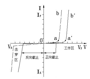 V>0時,V>VF的正向工作區IF隨VF指數上升IF=ISeqVF/KT