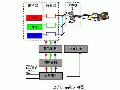 激光掃描LSD顯示,也叫做直觀式(點掃描)電視激光顯示,它是將經過信號調製了的RGB三色激光束直接通過機械掃描方法偏轉掃描到顯示屏上。在最小顯示係統中,瞬間隻有一個(ge) 像素被點亮,係統通過快速分時的逐點點亮每一個(ge) 像素點,依靠人眼的視覺的時間誤差,形成一個(ge) 統一的顯示畫麵。