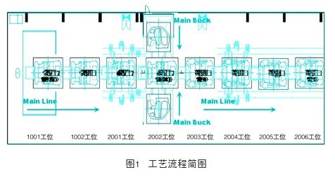 汽車的生產(chan) 製造由四大工序組成:衝(chong) 壓、焊接、塗裝和總裝。簡單來說,衝(chong) 壓工序是完成車身各個(ge) 部位零部件的加工;焊接工序是完成整個(ge) 車身零部件的焊接;塗裝工序是完成車身的噴塗;總裝工序是完成發動機、座椅、汽車控製係統及內(nei) 飾等的安裝。主線和合裝工位屬於(yu) 焊接工序,是焊接生產(chan) 線的重要組成部分。本係統由夾具和電控係統組成。項目簡要工藝流程如圖1所示。