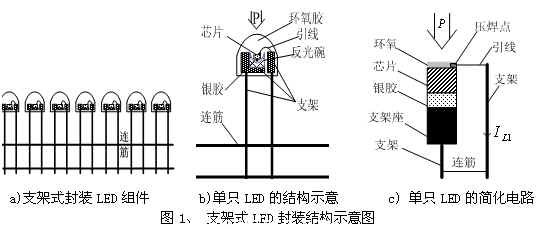 對於(yu) 支架式封裝的LED而言,在封裝過程中是將一組連筋的支架裝夾在封裝機上,然後將芯片與(yu) 支架封裝在一起,構成圖1所示的支架封裝結構。由圖1(b)、(c)可以看出,LED的支架、支架連筋、引線、銀膠與(yu) LED芯片一起,構成了一個(ge) 完整的外電路短接通道,正符合光伏效應的工作要求。而對於(yu) LED封裝質量的常規檢測方法而言,這種工作條件是完全無法開展檢測的。