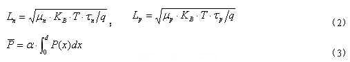 其中,μn、μp分別為(wei) 電子、空穴遷移率(與(yu) 材料本身、摻雜濃度以及溫度有關(guan) ),KB為(wei) 玻爾茲(zi) 曼常數,T為(wei) 開氏溫度,τn、τp分別為(wei) 電子、空穴載流子壽命(與(yu) 材料本身及溫度有關(guan) ),α為(wei) 半導體(ti) PN結材料本身、摻雜濃度以及激勵光的波長有關(guan) 的材料吸收係數,d是PN結的厚度,P(x)是在PN結內(nei) 位置x處的激勵光強度。