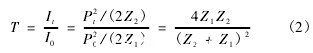 式中:P0為(wei) 入射波的聲壓;Pr為(wei) 反射波的聲壓;r為(wei) 界麵的聲壓反射率;Z1為(wei) 第一種介質的聲阻抗;Z2為(wei) 第二種介質的聲阻抗。若已知透射波聲強It,則不同界麵的聲強透過率T為(wei)
