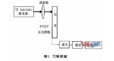 激光超聲檢測實驗裝置如圖1。由Q-Nd:YAG激光器產(chan) 生的波長為(wei) 1.06μm,脈衝(chong) 寬度為(wei) 15ns的激光脈衝(chong) 經球麵鏡聚焦成直徑約為(wei) 1mm的點源後照射到刀具表麵,激發出超聲波信號。該係統激光器為(wei) 華北機電研究所研製,由振蕩級和放大級組成,通過調節放大級的工作電壓可以改變激光束的能量,本文中激光器輸出單脈衝(chong) 最大能量為(wei) 120mJ。超聲信號由粘貼在試樣表麵的PVDF壓電薄膜來接收,經放大、濾波處理後送入TDS2012雙通道數字示波器進行采集,並保存數據。
