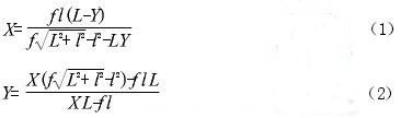 讓激光垂直照射到被測物麵標樣的表麵,光束照在 A 點,反射到 CCD 光敏麵上的 點,A 點反射到CCD 光敏麵上的 點,當所測距離 Y 不同時, 反映在光敏器件上的光點像位置 X 也隨之不同,根據圖 1 所示三角關(guan) 係和牛頓物像關(guan) 係公式,可得兩(liang) 者之間的關(guan) 係為(wei) :