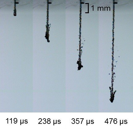 每次激光脈衝(chong) 僅(jin) 持續1/4000秒,在推進液體(ti) 中產(chan) 生蒸汽泡沫,泡沫的壓力在水和藥物之間的薄膜上產(chan) 生彈性應變,導致藥物能夠從(cong) 微型噴管中強有力地噴射出來。藥物噴流的直徑僅(jin) 有150微米,比人體(ti) 頭發的直徑略大一點。