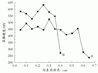對所取試樣進行強化層斷麵顯微硬度分析,由於(yu) 激光處理後組織非常細小,所以沿深度方向等距離打顯微硬度可以比較準確地表示硬化層由表及裏的硬度變化。溶凝層顯微硬度曲線如圖5所示。