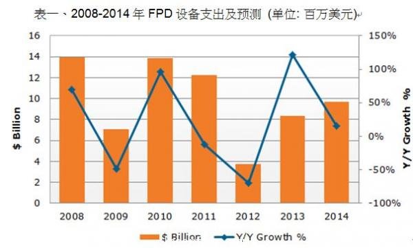 據DisplaySearch 根據NPD DisplaySearch最新的FPD供需和資本支出季度報告顯示,2012年在FPD製造設備上的支出為(wei) 38億(yi) 美元,預測2013年將飆升121%至83億(yi) 美元。
