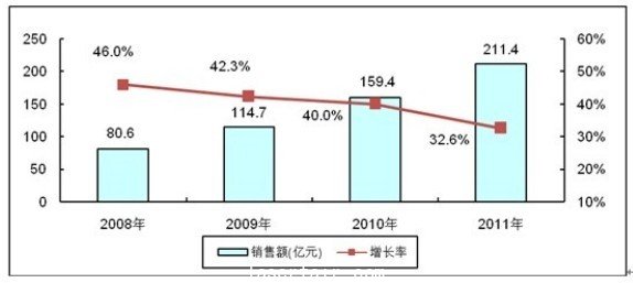 隨著國家政策的大力推動,製造成本的下降和發光效率等技術的不斷突破,LED對傳(chuan) 統照明市場的替代效應極大激發了半導體(ti) 照明市場的需求。2011年,中國半導體(ti) 照明市場規模為(wei) 211.4億(yi) 元,同比增長32.6%。半導體(ti) 照明替代傳(chuan) 統照明而產(chan) 生的市場空間巨大,這使得未來幾年中國半導體(ti) 照明市場都將保持高速平穩的增長態勢。