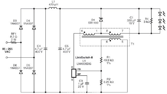 圖1. 使用LNK605DG設計的4.2 W LED驅動器