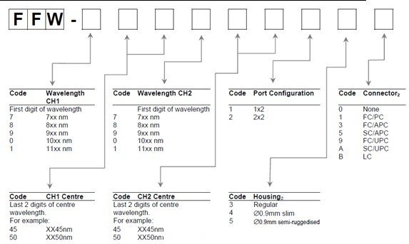 例如:FFW-780060130 (熔融波分複用光纖,780/1060,1x2,普通外殼,1米尾纖,沒有連接器)