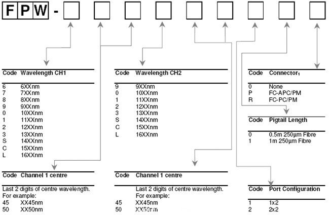 例如:FPW-980060110(熔融波分複用光纖,980/1060,1x2,1米尾纖,沒有連接器)