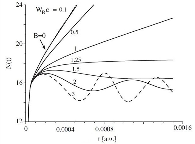 圖1. 不同磁場寬度下正負電子對的產(chan) 生數隨時間的變化關(guan) 係。其中WB=1.25/c約為(wei) 電子在磁場中的回旋半徑:磁場寬度小於(yu) 回旋半徑時,粒子數持續產(chan) 生,係統為(wei) 超臨(lin) 界;磁場寬度大於(yu) 回旋半徑時,係統變為(wei) 次臨(lin) 界。