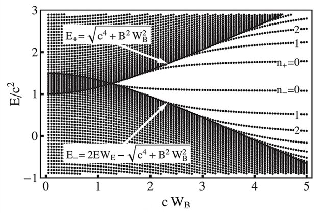 圖2. 根據總哈密頓量得到的能級分布隨磁場寬度WB變化關(guan) 係。寬度小於(yu) 回旋半徑時,正負能態交疊,能夠持續產(chan) 生電子對;寬度大於(yu) 回旋半徑時,正負能態分離並出現離散的朗道能級。
