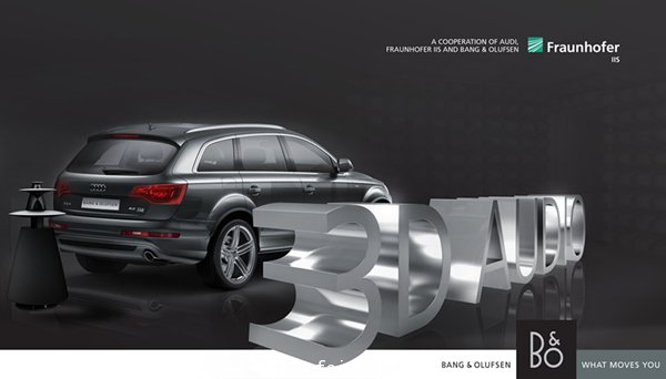 2013年1月16日,北京— 世界知名的音頻和多媒體(ti) 技術研究機構Fraunhofer IIS攜手全球獨家高質音頻與(yu) 視頻產(chan) 品供應商Bang & Olufsen及奧迪公司宣布,其在車載音頻3D音效技術領域取得突破。通過三方合作,3D音頻解決(jue) 方案被引入奧迪Q7概念車,並在2013年消費電子展(CES)奧迪展台上亮相。