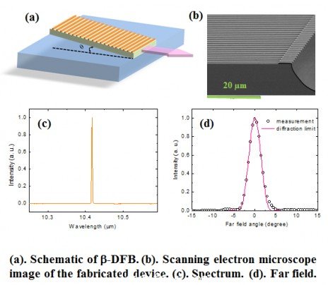 (a)β-DFB原理圖(b)對該設備的掃描電子顯微鏡成像(c)頻譜(d)遠場圖樣
