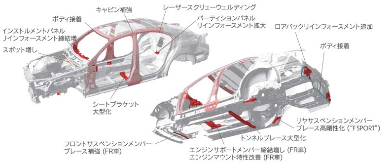 另一方麵,新開發的激光焊接方法則是在點焊的焊點之間形成多個(ge) 圓形的焊接部。外表看來,會(hui) 形成與(yu) 點焊相同的直徑在5毫米左右的圓形焊接點。豐(feng) 田並未公布使焊接點形成圓形的具體(ti) 方法,不過根據名稱想像的話,估計是通過螺旋狀的照射激光形成的。LS通過在點焊的焊點之間形成多個(ge) 這種圓形焊接點,與(yu) 形成連續的線幅1毫米左右焊縫的激光焊接相比,增加了接合麵積。由於(yu) 接合麵積增加,因此可抑製車門開口部的變形,車身剛性的提高得以實現。