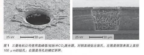 至於(yu) 微米級盲孔,曾經由紫外激光器加工直徑40μm級的盲孔,現已由CO 2 激光鑽孔設備實現,該設備安裝了高性能f-θ透鏡,使光學畸變減至最小。此外,這一最新的激光鑽孔設備能夠用四束分束的激光同時加工四個(ge) 孔,達到每秒4500個(ge) 孔的高速加工。這種CO 2 激光器微孔加工方式比紫外激光器具有更好的經濟效率,證明了它有利於(yu) 降低高端半導體(ti) 封裝的生產(chan) 成本。