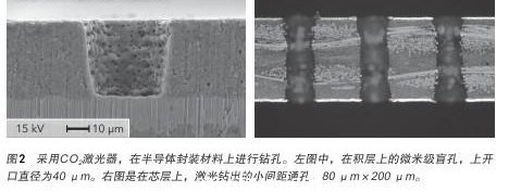 除了HDI板的加工應用,CO 2 激光器的盲孔加工技術還應用於(yu) 內(nei) 置矽集成電路芯片的半導體(ti) 封裝工藝中。半導體(ti) 封裝有兩(liang) 種類型的層:一個(ge) 核心層,以確保電路板的剛性,另一個(ge) 是積層,以形成電氣接口與(yu) 矽集成電路芯片的超細電路。由於(yu) 矽集成電路芯片的高度集成,半導體(ti) 封裝必須結合高密度互連電路。在這一領域,該技術要求在積層上加工微米級的盲孔,直徑小於(yu) 50μm;以及在核心層加工直徑100μm的小通孔。圖2顯示了采用CO 2 激光器加工的盲孔和小通孔。