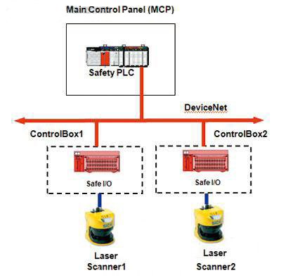 激光掃描雷達作為(wei) 控製係統的核心,為(wei) 了滿足該控製係統SIL3安全等級,該係統的設計采用如下結構:安全輸入設備(激光雷達)、安全控製電氣元件(安全PLC和安全總線)和安全輸出控製(安全IO),其整個(ge) 控製係統架構如圖3所示。