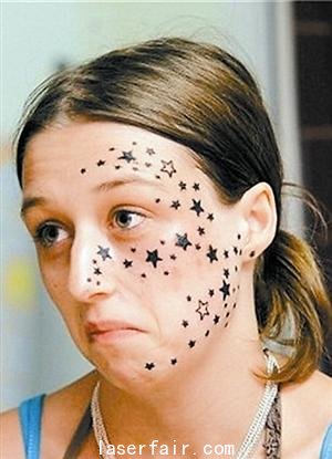 據英國《每日郵報》網站6月1日報道,這名22歲女孩金貝莉·弗拉曼克,在2009年未經慎重考慮就在自己的左臉上文了56顆星星。起初,她向父母和媒體(ti) 編造謊言稱,自己隻是想在左眼旁邊文3顆星星,不過文身師卻在其打盹的過程中一口氣密密麻麻文了56顆,導致自己容貌全失。
