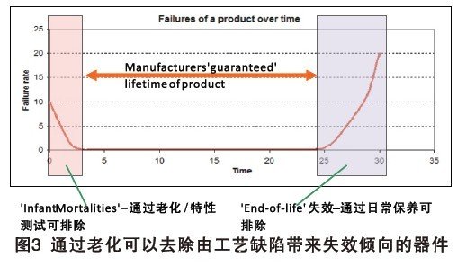 在量產過程中,總會有一些工藝上的差別,例如某特定部件的厚度的不一致,無論是係統性的還是隨機性的。為了確保合格率,所有厚度偏差在指定規格內的部件都被認為是合格的,這種情況對於每個獨立部件或材料成分都是如此。 當特定的一組隨機差異作用於(yu) 一獨立產(chan) 品時,有時會(hui) 導致某種明顯失效的發生,甚至是經特性檢測合格的產(chan) 品的壽命縮短。這些早期發生的失效,即我們(men) 說的“Infant Mortalities”,可以通過製造流程中對產(chan) 品的加速老化並監測特性參數的變化來加以甄別。