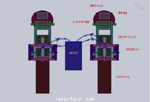 圖4 給出了一種高效的適合於(yu) TFT-LCD框架大規模生產(chan) 激光焊接解決(jue) 方案,此方案已經在多個(ge) 大型TFT-LCD框架生產(chan) 工廠得到了成功應用。此方案用於(yu) 一個(ge) 工件兩(liang) 條焊縫,其采用一台激光器連接兩(liang) 條自動化生產(chan) 線。