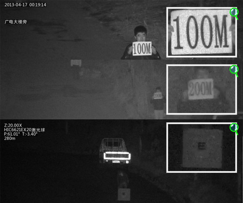 圖2:宇視激光球機效果。白框(寬度170像素)內(nei) 為(wei) 1:1截圖,夜間可看清200米外人物特征,可探測400米外物體(ti) 輪廓