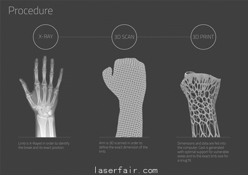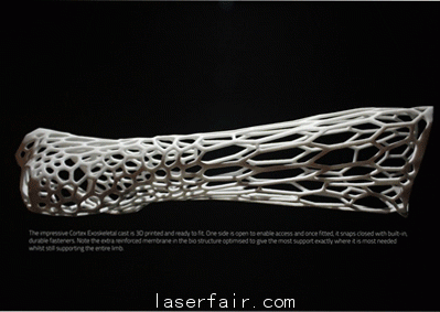 目前骨折康複輔助固定手段基本都是打石膏,如果你曾經打過石膏,你一定印象深刻:不透氣,難聞,悶起來的皮膚瘙癢難耐,又厚又笨,很不方便。曾有打石膏體(ti) 驗的 Jake Evill 決(jue) 心改變這一現狀,用3D打印技術,創立了 Cortex cast 項目。簡單來說,就是通過X光確定病人骨折部位之後,3D掃描病人的對應肢體(ti) 部位,然後3D打印出一幅輕量的、透氣的能夠貼合肢體(ti) 並提供有效支撐保護的框架式外殼。