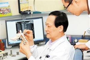 7月15日,劉忠軍(jun) (左)在辦公室裏與(yu) 助手一起研究用3D技術打印的微孔型人工樞椎。