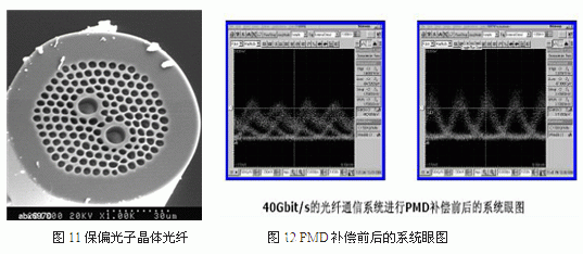 常規保偏光纖大多采用預製棒鑽孔的方法,然後置入應力硼棒,形成應力雙折射。光子晶體(ti) 光纖科學技術的出現,為(wei) 保偏光纖技術提供了新的途徑。目前,國外已經開始了光子晶體(ti) PMF的研究,利用氧化矽一空氣之間的折射率反差大,容易獲得高雙折射,研製出了保偏光子晶體(ti) 光纖(PCF).英國巴斯大學報道了其研製的高雙折射PCF,利用相同直徑不同壁厚的毛細管組合成預製棒,實現不同的微孔直徑.光纖外直徑125μm、節距1.46μm、小孔直徑0.54μm、大孔直徑1.14μm、在1 550 nm 的拍長為(wei) 410μm ,雙折射B =3.8 x 10-3 ,約為(wei) 目前熊貓型PMF的10倍.Theis P.hansen利用光子晶體(ti) 光纖可以高設計自由度的優(you) 勢,在光纖中引入雙纖芯,微孔點陣呈現三角形點陣,研製的光子晶體(ti) PMF雙折射達到1.0x10-3 .目前研製的光子晶體(ti) PMF在1 550 am 窗口的損耗為(wei) 1.3 dB/km,並以10 Gbit/s的速率進行1.5 km的傳(chuan) 輸係統試驗。烽火通信在國家科技計劃的支撐下開展了光子晶體(ti) 保偏光纖的研究,製備出如圖11所示的保偏光子晶體(ti) 光纖,其模雙折射B=3.1x10-3。並進行了10G通信係統的PMD補償(chang) 試驗研究:圖12中的左圖表示係統沒有進行PMD補償(chang) 時的眼圖,係統的固定DGD為(wei) 16ps,可以看出信號嚴(yan) 重地受到係統PMD的影響而不能正常工作;采用圖11所示的保偏光子晶體(ti) 光纖對係統進行PMD補償(chang) 後,圖12中的右圖顯示通信係統的眼圖睜開,係統恢複正常工作。#p#分頁標題#e#