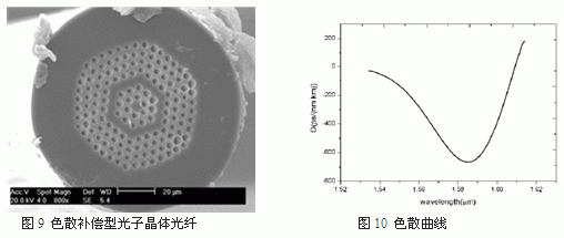 常規色散補償(chang) 光纖模塊對G.652光纖的補償(chang) 比率在1:8~1:10,如果采用光子晶體(ti) 前沿技術進行補償(chang) ,理論上可以達到1:100的補償(chang) 比率,實現色散的高效補償(chang) 。烽火通信在國家科技計劃的支撐下,研製出高負色散光子晶體(ti) 光纖(見圖9)。該光纖測試的色散曲線見圖10所示,其峰值波長為(wei) 1570nm,峰值負色散為(wei) -666.2ps/nm.km,其補償(chang) 帶寬為(wei) 40nm,補償(chang) 比率3倍以上。