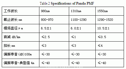 國際上,目前有各種類型的保偏光纖產(chan) 品進入市場,知名的保偏光纖製造公司有生產(chan) 領結型保偏光纖的FiberCore公司,有生產(chan) 橢圓包層保偏光纖的3M公司,以及生產(chan) 熊貓型保偏光纖的Fujikura,Corning ,Nufern、YOFC和OFS等公司。所有的這些公司生產(chan) 的保偏光纖都具有良好的雙折射性能。目前市場需求量為(wei) 5000km,市場容量在5000萬(wan) 元左右,國內(nei) 對保偏光纖的需求量逐年增大,表2為(wei) 典型的熊貓型保偏光纖的技術指標。