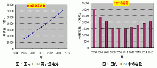 高速大容量光通信係統需求的寬帶色散補償(chang) 光纖及其器件(DCM)成功商用,實現C波段的色散和色散斜率的雙功能補償(chang) ,並且大規模應用在波分複用(WDM)及OTN光通信係統中,解決(jue) 了該器件依賴於(yu) 進口的局麵。隨著密集波分係統的規模化建設,國內(nei) 對色散補償(chang) 光纖模塊的需求量迅速增長,預計到2015年國內(nei) 需求將達到60000套(見圖7),市場容量將達到2.2億(yi) 元(圖8)。