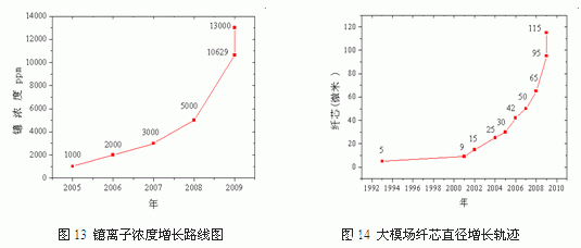 烽火通信采用自主知識產(chan) 權的專(zhuan) 利技術,實現了稀土離子摻雜技術突破,鐿離子濃度迅速突破13000ppm(見圖13所示),雙包層摻鐿光纖的纖芯直徑迅速突破100微米的技術關(guan) 隘,達到115微米(見圖14所示)。
