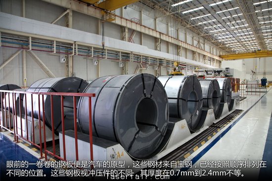 眼前的一卷卷的鋼板便是汽車的原型,這些鋼材來自寶鋼,已經按照順序排列在不同的位置。這些鋼板視衝(chong) 壓件的不同,其厚度在0.7mm到2.4mm不等.