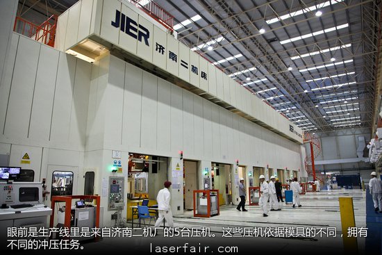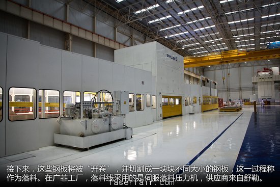 在廣菲工廠,落料線采用的是伺服落料壓力機,供應商來自舒勒,較高的生產(chan) 效率、較低的能耗是其特點。據廠方介紹,落料線一分鍾能衝(chong) 壓75次,而普通的設備同樣時間內(nei) 衝(chong) 壓次數僅(jin) 有四十餘(yu) 次。