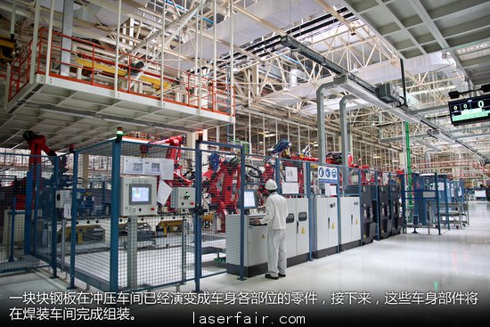 一塊塊鋼板在衝(chong) 壓車間已經演變成車身各部位的零件,接下來,這些車身部件將在焊裝車間完成組裝。