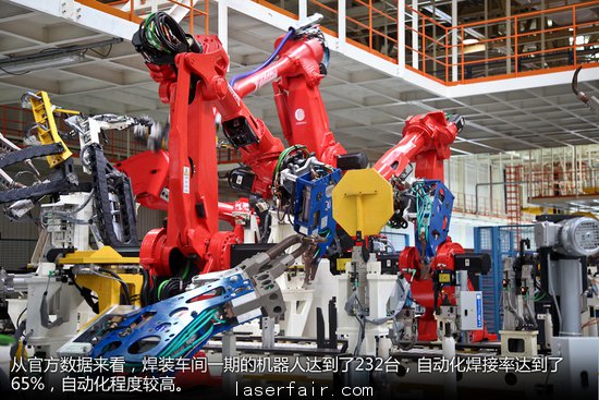 從(cong) 官方數據來看,焊裝車間一期的機器人達到了232台,自動化焊接率達到了65%,自動化程度較高。