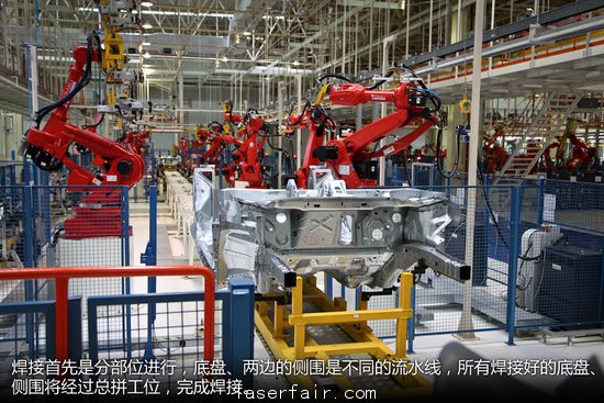 焊接首先是分部位進行,底盤、兩(liang) 邊的側(ce) 圍是不同的流水線,所有焊接好的底盤、側(ce) 圍將經過總拚工位,完成焊接。