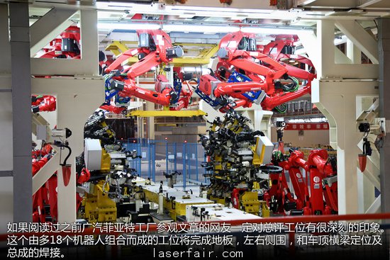 如果閱讀過之前廣汽菲亞(ya) 特工廠參觀文章的網友一定對總評工位有很深刻的印象。這個(ge) 由多18個(ge) 機器人組合而成的工位將完成地板,左右側(ce) 圍,和車頂橫梁定位及總成的焊接。
