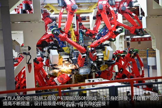工作人員介紹,總拚工位投產(chan) 初期能在60秒完成一台車身的焊接,並隨著產(chan) 能的提高不斷提速,設計極限是49秒完成一台車身的焊接!