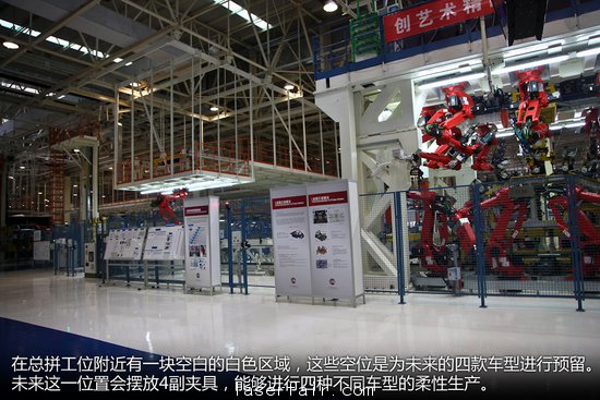 在總評工位附近有一塊空白的白色區域,工作人員透露,這些空位是為(wei) 未來的四款車型進行預留。未來這一位置會(hui) 擺放4副夾具,能夠進行四種不同車型的柔性生產(chan) 。除菲翔三廂、兩(liang) 廂兩(liang) 種版本以外,未來與(yu) 菲翔共享平台的Jeep新一代指南者也有望在這裏投產(chan) 。