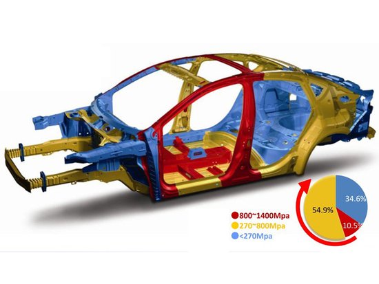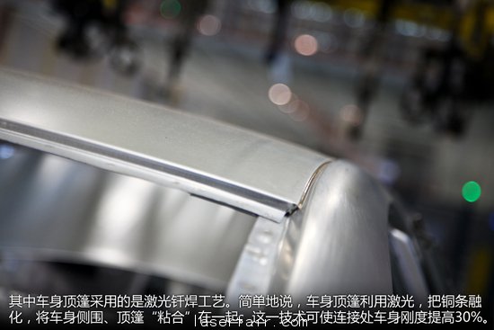 其中車身頂篷采用的是激光釺焊工藝。這一工藝是利用聚焦的激光能量,對鏈接部位進行加熱,使釺料融化填補焊縫,完成金屬板之間的鏈接。簡單地說,車身頂篷就是利用激光,把銅條融化,將車身側(ce) 圍、頂篷“粘合”在一起。這一技術可使連接處車身剛度提高30%。