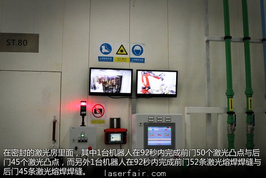 在密封的激光房裏麵,其中1台機器人在92秒內(nei) 完成前門50個(ge) 激光凸點與(yu) 後門45個(ge) 激光凸點,而另外1台機器人在92秒內(nei) 完成前門52條激光熔焊焊縫與(yu) 後門45條激光熔焊焊縫。