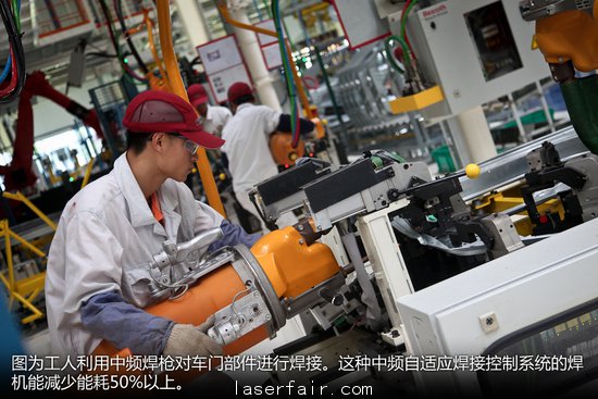 圖為(wei) 工人利用中頻焊槍對車門部件進行焊接。這種中頻自適應焊接控製係統的焊機能減少能耗50%以上。